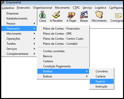 Para realizar acesso ao cadastro de Espécie acesse, cadastros, financeiro, boletos e espécie. Conforme imagem abaixo.