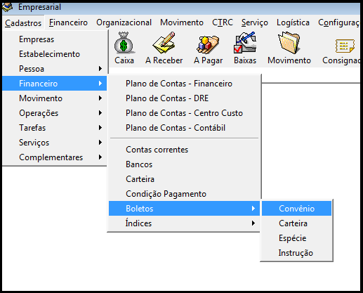 Para realizar acesso ao cadastro de Convênio acesse, cadastros, financeiro, boletos e convênio. Conforme imagem abaixo.