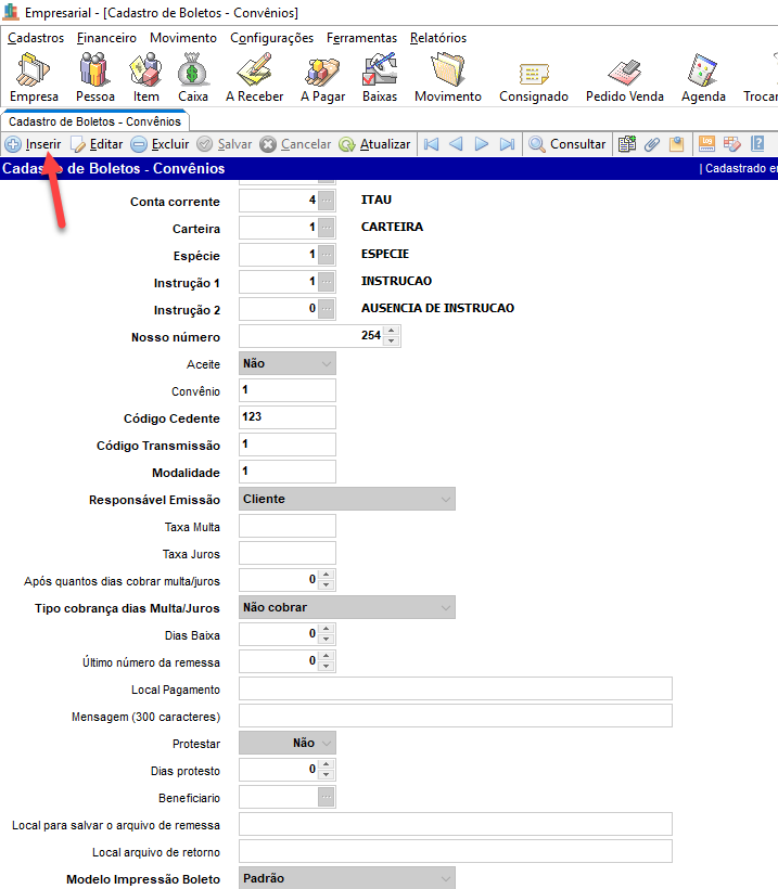 Para cadastrar Convênio clique no ícone inserir, preencha os campos necessários.