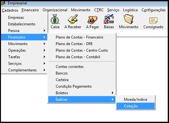 Para realizar acesso ao cadastro Cotações de Moeda acesse, cadastros, financeiro, índices e Cotação. Conforme imagem abaixo.