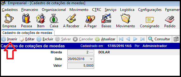 Para cadastrar Cotações de Moeda clique no ícone inserir, preencha os campos necessários, clique em salvar e pronto, cadastro efetuado. Conforme imagem abaixo.