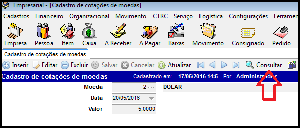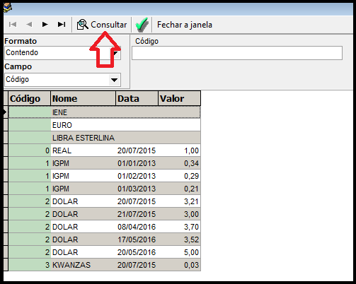 Ao acessar a tela clique em consultar e consultar na próxima tela novamente ira visualizar as Moedas cadastradas.