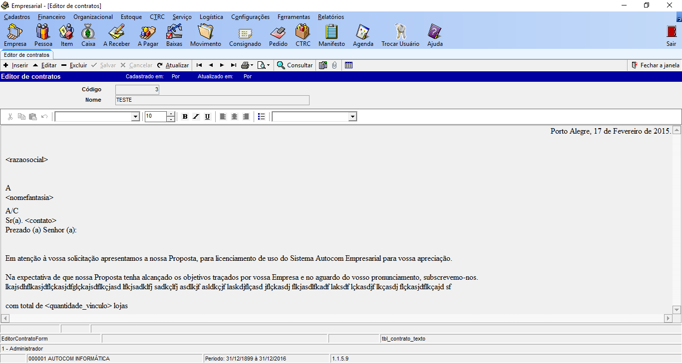 Utilize os botões da janela para inserir, editar, excluir ou salvar qualquer registro. Conforme tela abaixo: