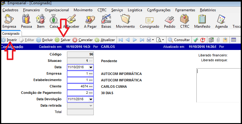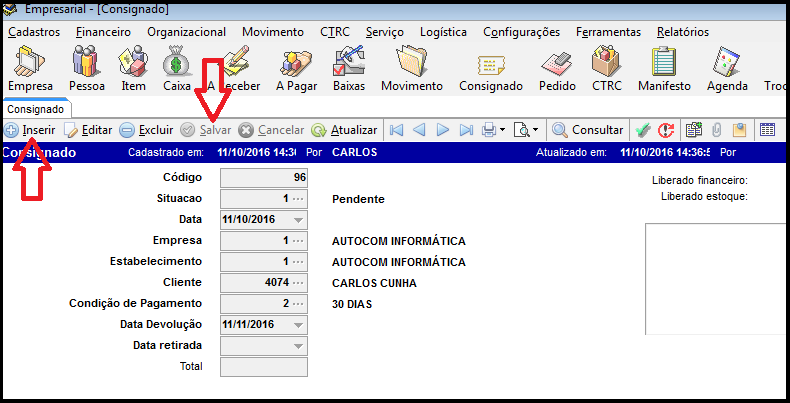 Para inserir consignado clique em inserir, preencha os campos em negrito e clique em salvar. Conforme imagem abaixo.