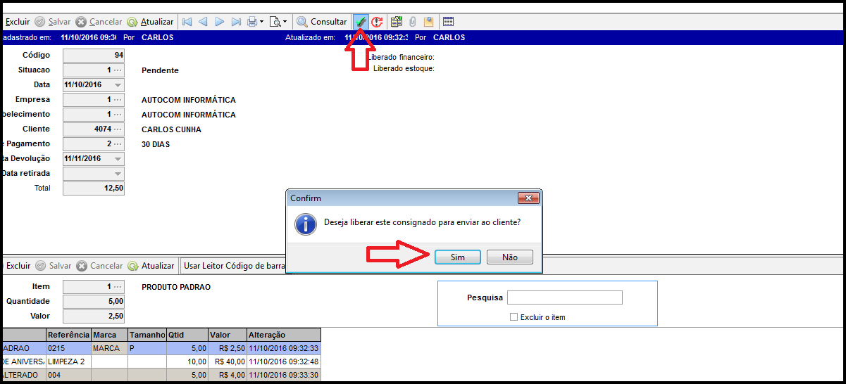 Apos informar os itens necessários para o consignado clique em concluir (check verde), vai abrir uma janela para confirmar se deseja liberar este consignado para enviar ao cliente? Clique em Sim. Conforme imagem abaixo.