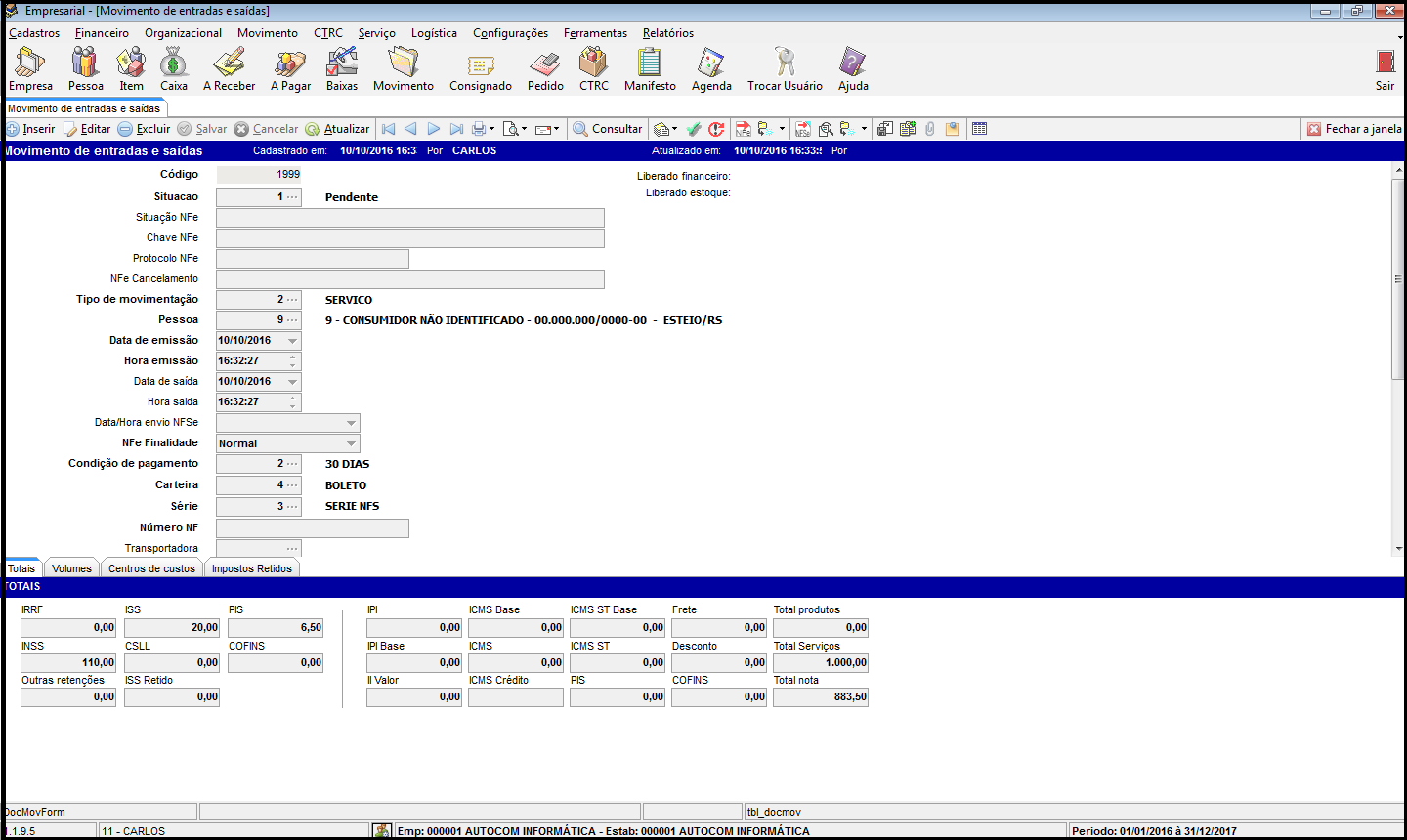 O Sistema irá preencher com os dados padrão os principais campos desta nota. Caso necessite, altere o tipo de movimento, selecionando o tipo de nota a ser emitida e demais campos.