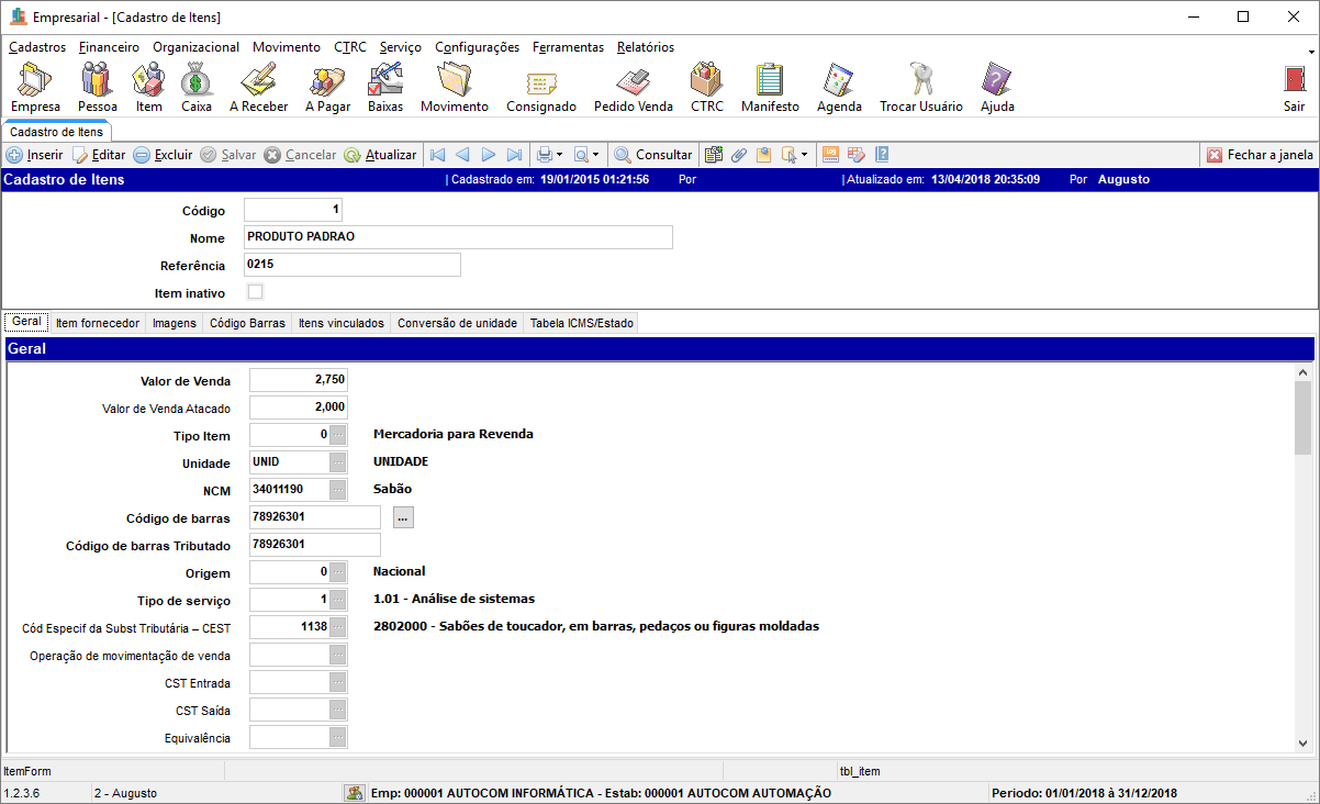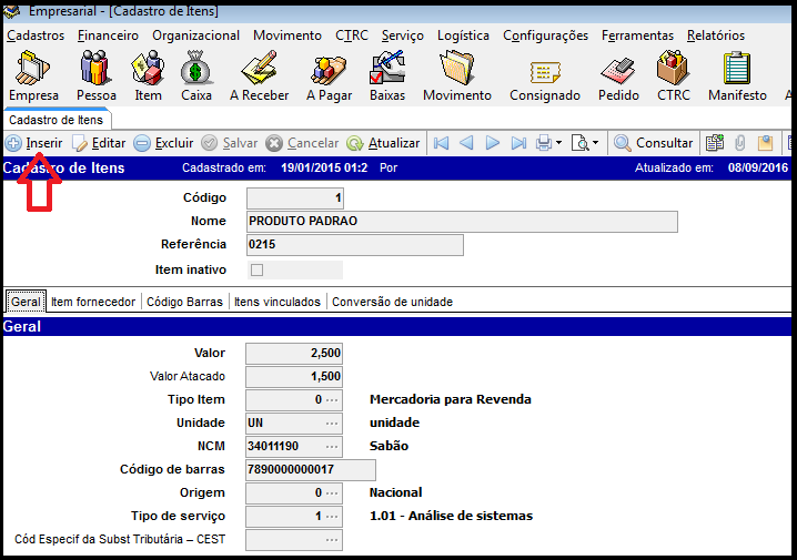 Para cadastrar um novo Item, clique no ícone inserir, preencha os campos conforme tabela mais abaixo com os dados necessários, clique em salvar e pronto, cadastro efetuado.