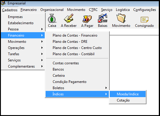 Para realizar acesso ao cadastro de Moeda/índices acesse, cadastros, financeiro, boletos e Moeda/índices. Conforme imagem abaixo.