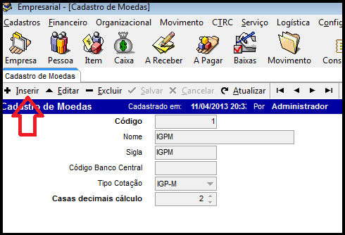 Para cadastrar Moeda/índices clique no ícone inserir, preencha os campos necessários, clique em salvar e pronto, cadastro efetuado. Conforme imagem abaixo.