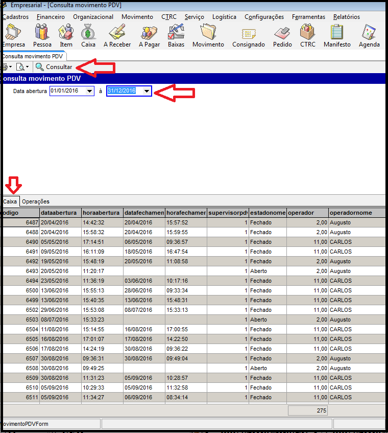 Para realizar consulta referente ao caixa realizado no dia clique duas vezes na linha desejada referente o dia de abertura ou fechamento do caixa , vai abrir a operação realizada no dia. Conforme as imagens abaixo.