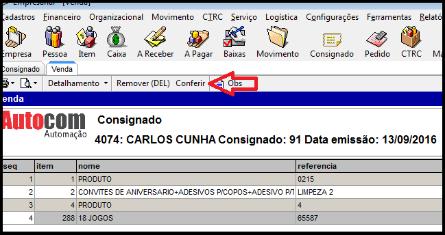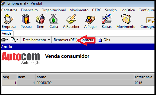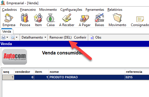 Para remover algum produto, clique no botão “Remover”, na barra de botões superiores.