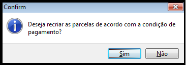Será solicitado recalcular as parcelas informadas para ajustar de acordo com a condição de pagamento selecionada, clique sim.