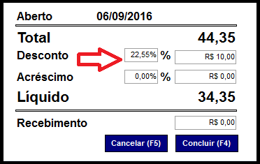 Ao ajustar o valor do desconto, o sistema irá recalcular o valor do percentual e vice-versa. Nesta operação pode-se ter que repetir, por questão de arredondamento de valor, bastando ajustar novamente o valor.