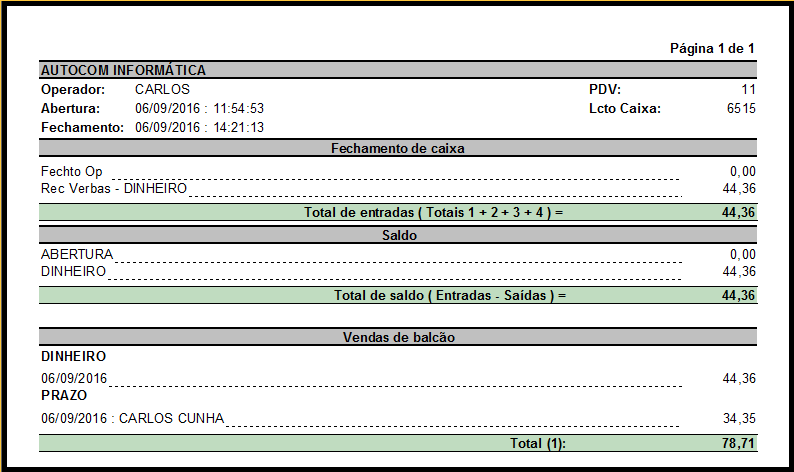 Ao confirmar, as operação deste dia serão encerradas e será exibido o relatório de fechamento do caixa. Conforme imagem abaixo;