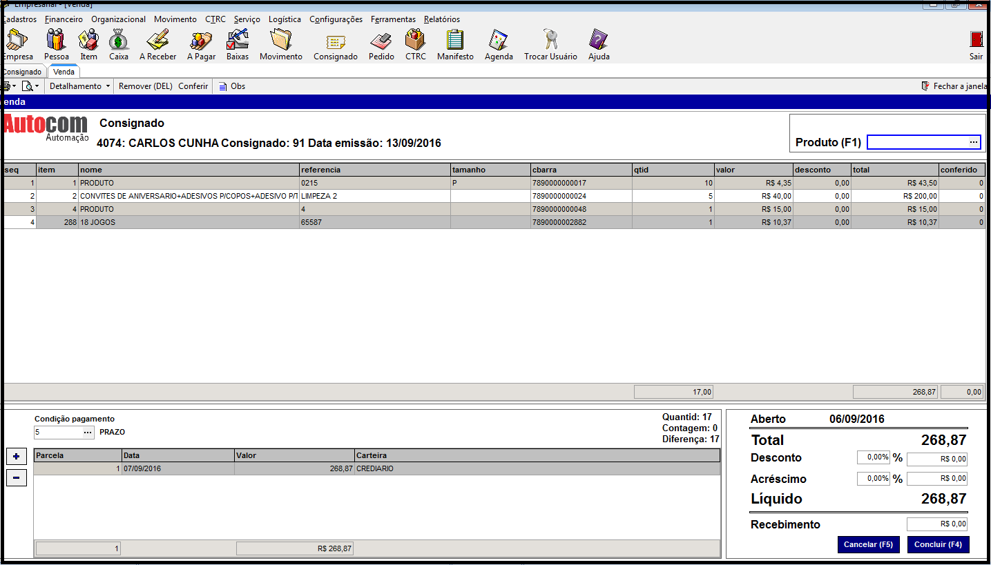 Ao selecionar o consignado todos os produtos serão inseridos na tela. Conforme imagem abaixo;