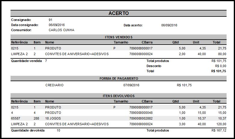 Ao clicar sim ira demonstrar o acerto dos itens vendidos, devolvidos e a forma de pagamento. Conforme imagem abaixo;