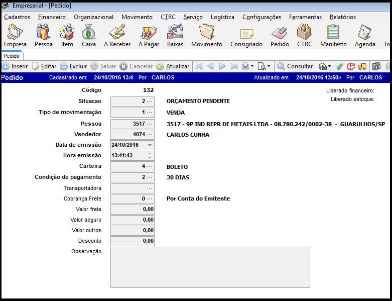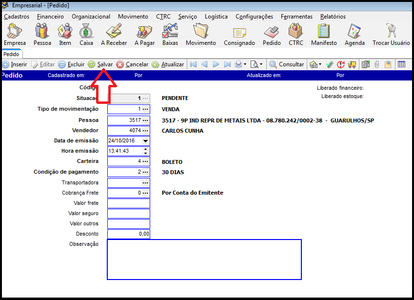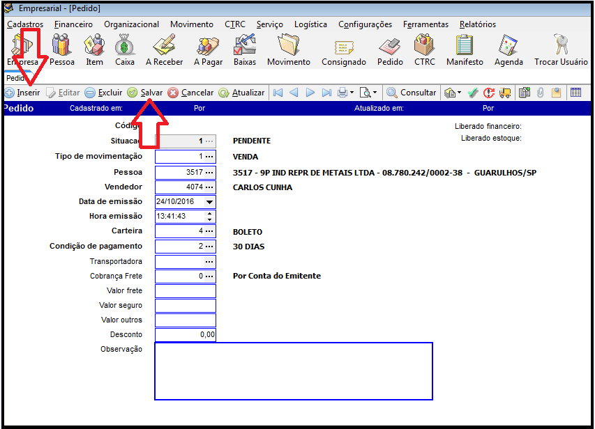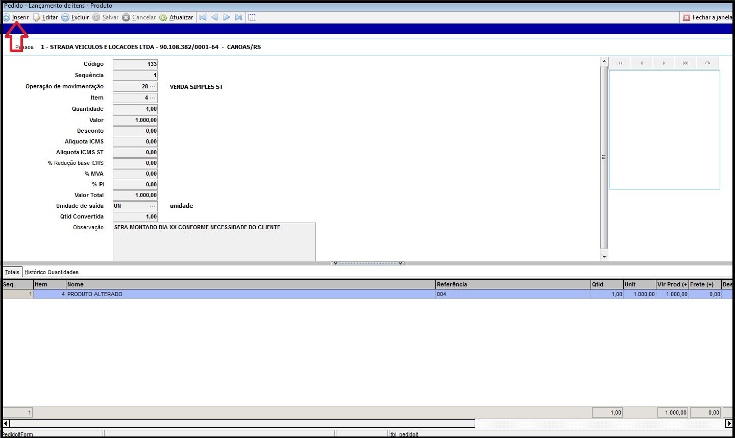 Para inserir um pedido clique em inserir, preencha os campos em negrito e clique em salvar. Conforme imagem abaixo.