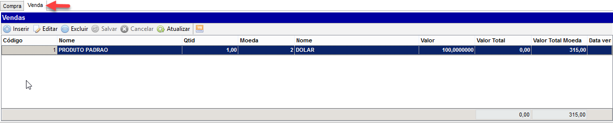 | Moeda | Moeda utilizada para efetuar a transação e atualização do valor |