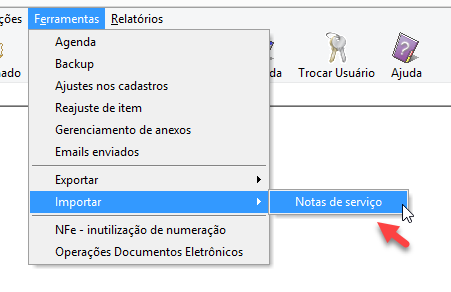 Para importar o arquivo com layout específico, contendo os dados para geração das notas, acesse o menu: Ferramentas / Importar / Notas de serviço