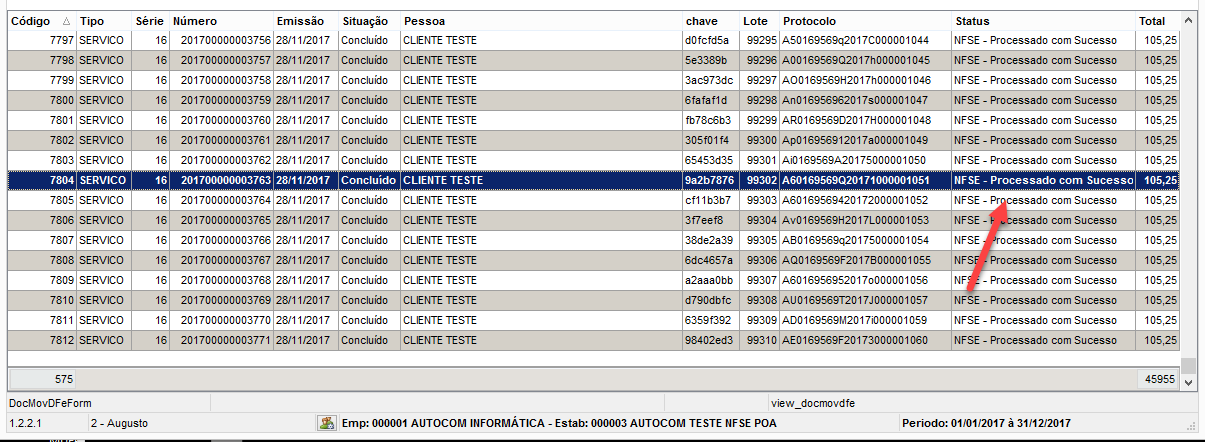 Ao abrir o arquivo, será exibido todos os registros deste arquivo, onde cada um deles será uma nota gerada, conforme tela abaixo: