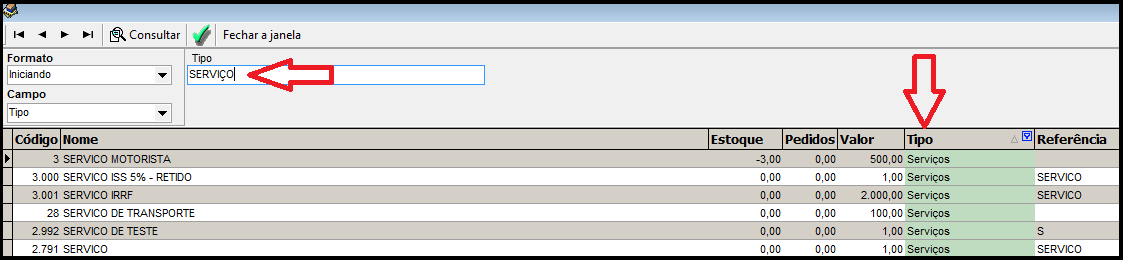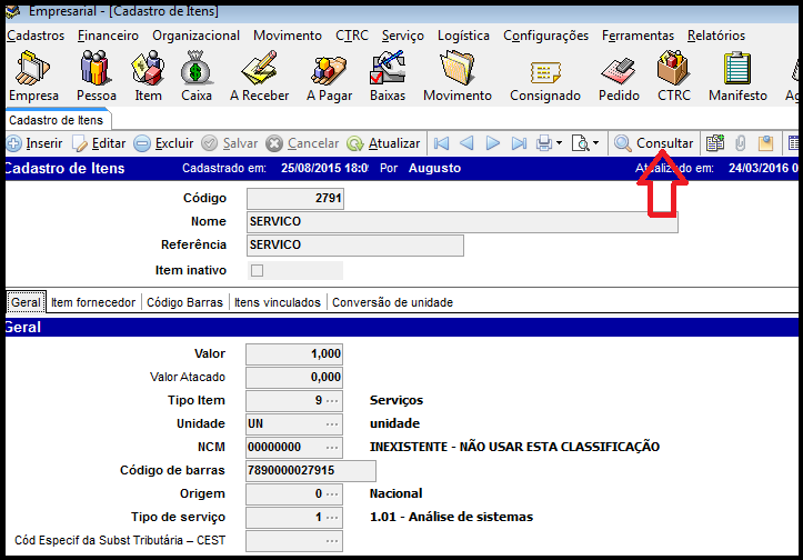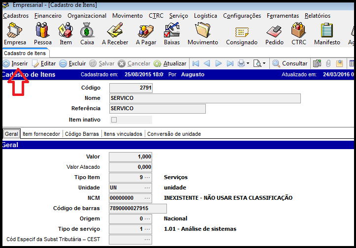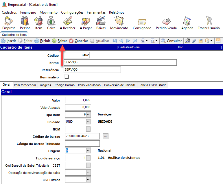 | Item inativo | Sim | Este item só deve ser sinalizado, caso o tipo de serviço não seja mais usado |