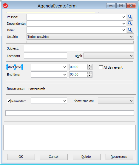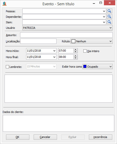 Os campos de preenchimento não são obrigatórios, serão utilizados de acordo com cada situação. Para os casos onde será registrado o atendimento e posterior venda é necessário o cadastramento da pessoa e seleção do item respectivo ao evento. Caso seja apenas para registro de um evento na agenda basta informar o assunto e a hora de início e fim.