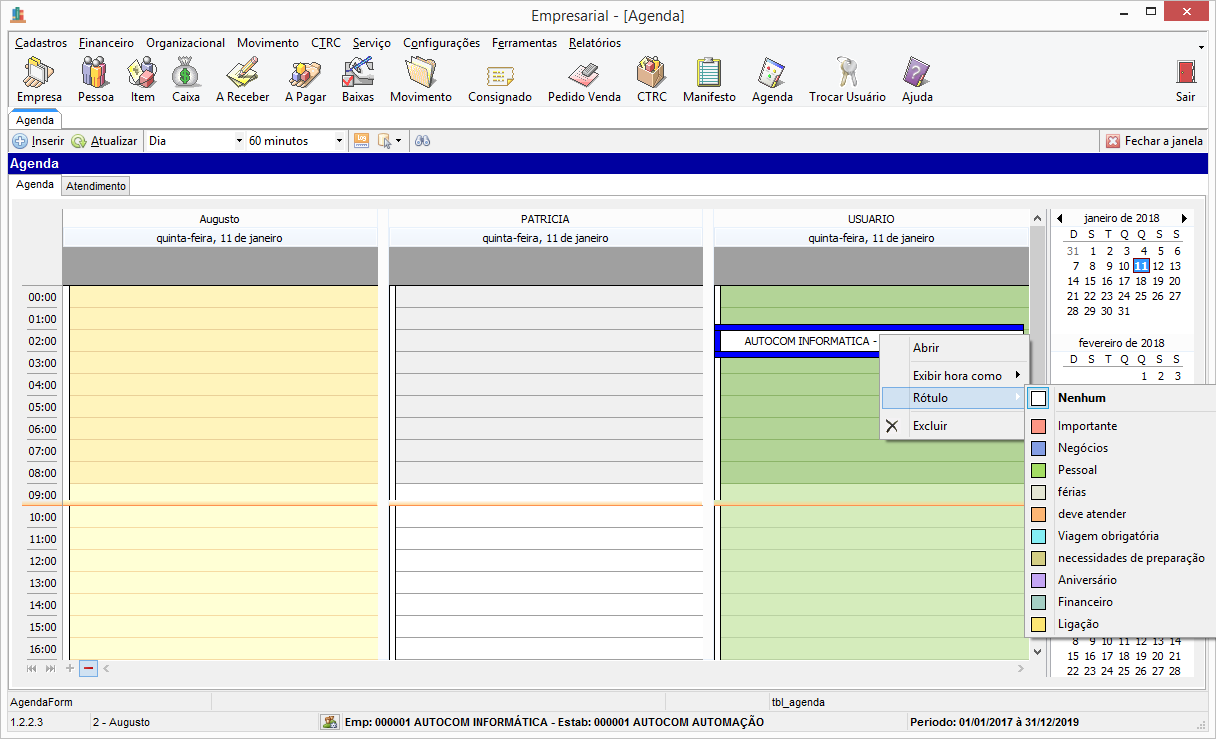 A agenda permite o agrupamento de eventos por usuários cadastrados, exibindo os eventos conforme imagem abaixo: