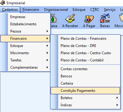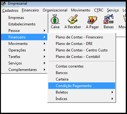 Para realizar acesso ao cadastro de Condição Pagamento acesse, cadastros, financeiro e Condição Pagamento. Conforme imagem abaixo.