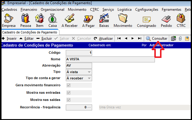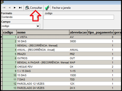 Ao acessar a tela clique em consultar e consultar na próxima tela novamente ira visualizar as condições cadastradas no qual sera utilizado para definir a Condição de pagamento. Conforme imagem abaixo.
