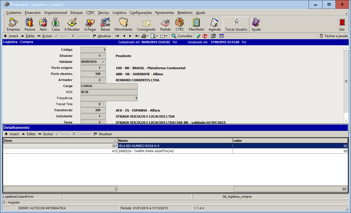 Após salvar, insira na parte inferior da tela os serviços prestados e valor de custo desta operação para posterior utilização na tela de controle da logística.