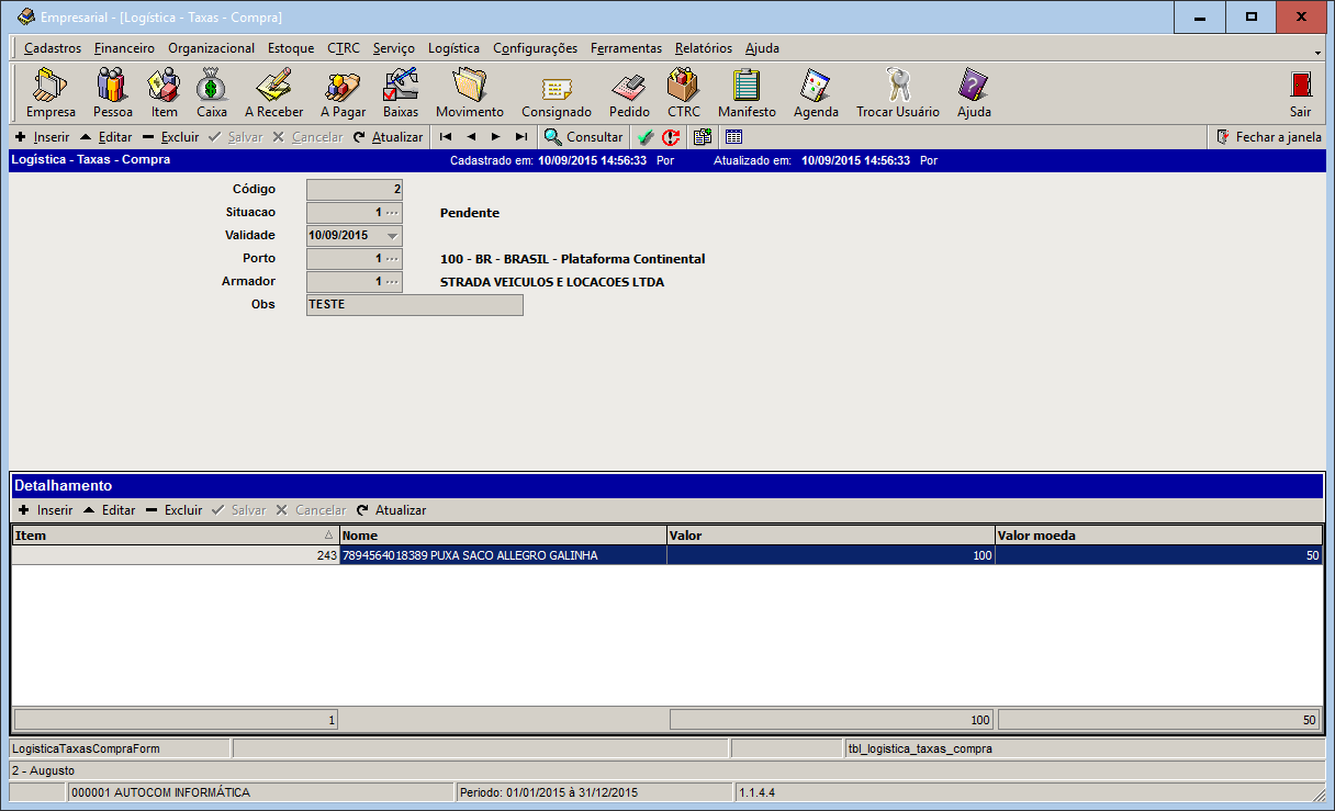 Após salvar, insira na parte inferior da tela as operações associadas a esta taxa, com o valor em reais e o valor em moeda extrangeira.