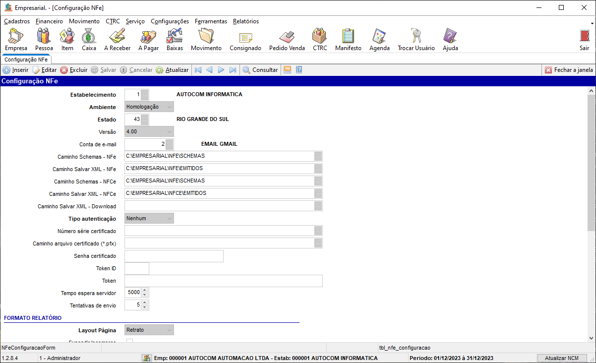 Nesta tela, você configura as informações que o sistema utiliza para emissão de Notas Fiscais de Produto (NFe/NFCe)