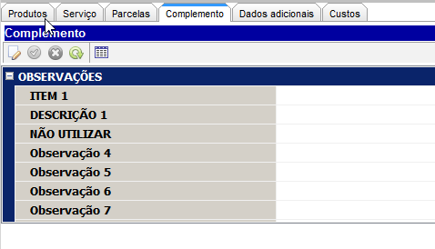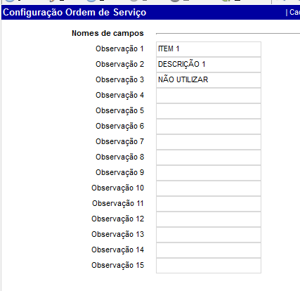 No grupo de campos "Nomes dos campos" tem a relação das 15 observações disponiveis para utilização na ordem de serviço, onde você pode informar como deverá aparecer as mesmas na tela de ordem de serviço.