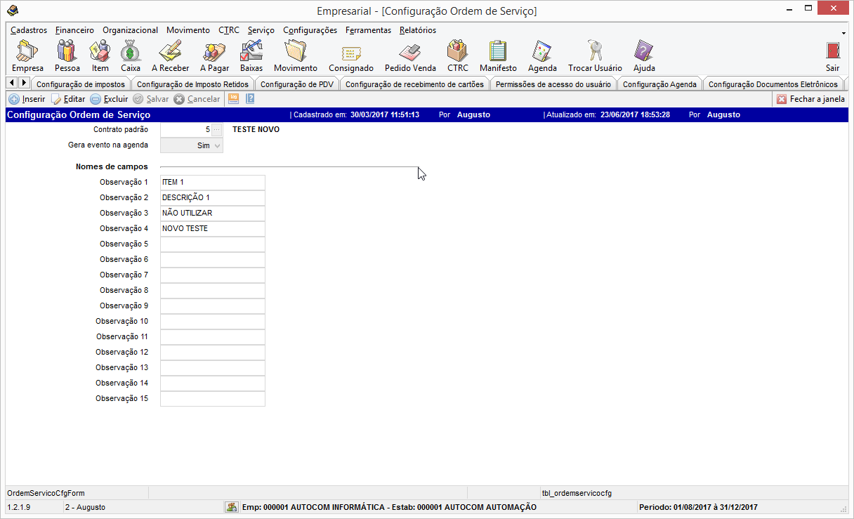 Nessa tela, você pode efetuar as configurações da tela de ordem de serviço. Na primeira configuração, deve-se inserir primeiramente e posteriormente, pode-se editar esta configurações.