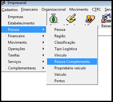 Para realizar acesso ao cadastro de Pessoa Complemento acesse, cadastros, pessoa e Pessoa Complemento. Conforme imagem abaixo.