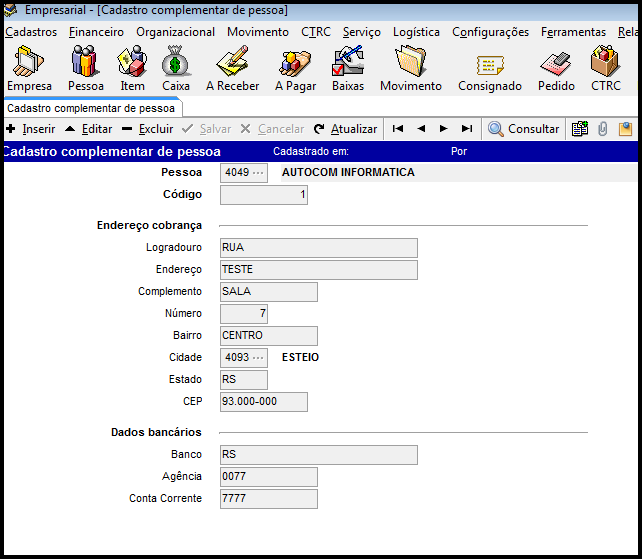 Para cadastrar pessoa complemento clique no ícone inserir, no campo pessoa selecione a quem vai atribuir o complemento, informe os dados necessários, clique em salvar e pronto, cadastro efetuado. Conforme imagem abaixo.
