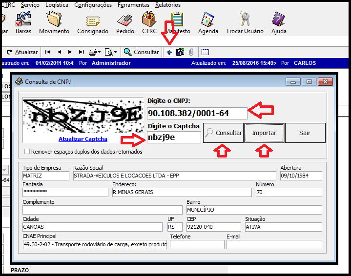 No caso de pessoas jurídicas, pode-se consultar os dados cadastrais através do site da receita federal, pelo sistema, clicando no botão "Consulta Receita Federal"