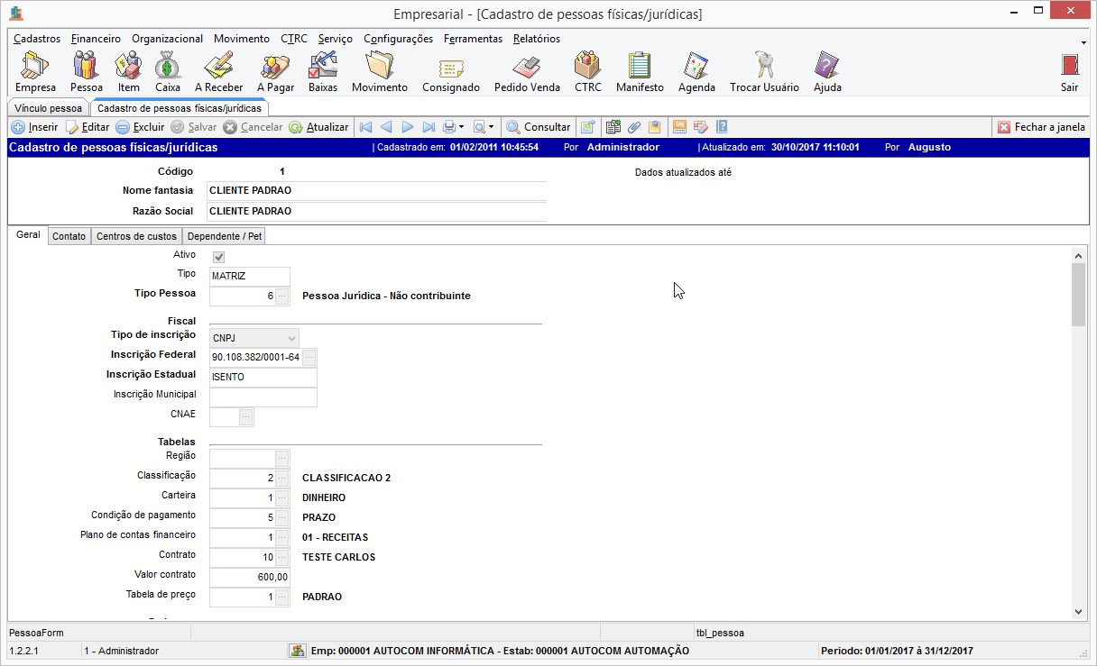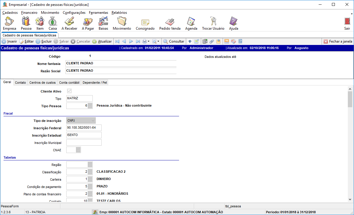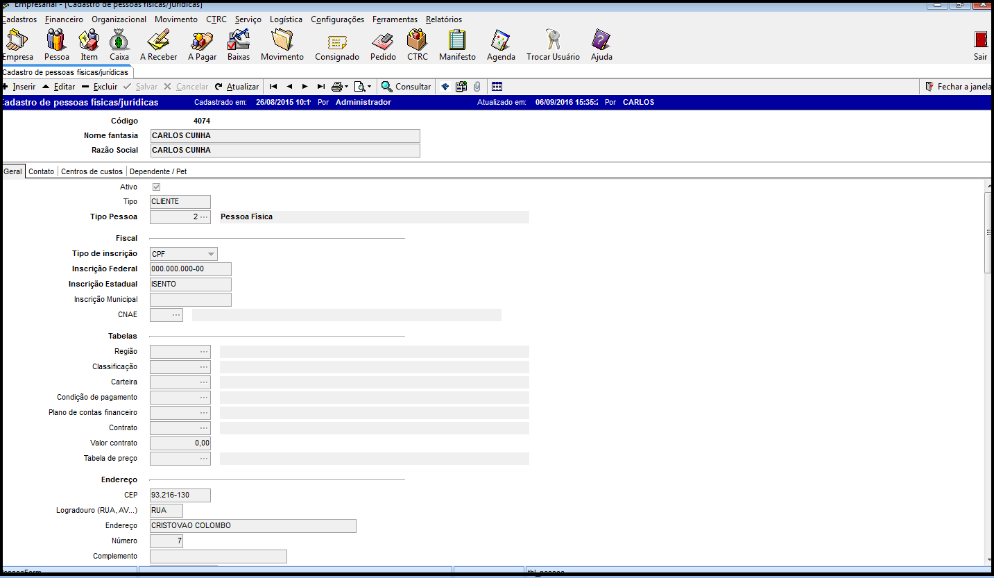 Nesta tela é possível cadastrar tanto pessoas físicas (clientes, prestadores de serviço, funcionários, etc.) como pessoas jurídicas (clientes, fornecedores, transportadoras, etc.).