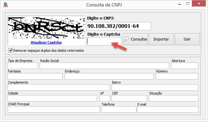Preencha o captcha conforme a imagem exibida no campo apontado e clique no botão Consultar, o sistema irá buscar os dados diretamente do site da Receita Federal. Ao exibir os dados, clique no botão Importar, todos os campos correspondentes do sistema serão preenchidos, bastando verificar se os dados estão corretos (endereço, telefone, email) e após, clicar no botão IMPORTAR