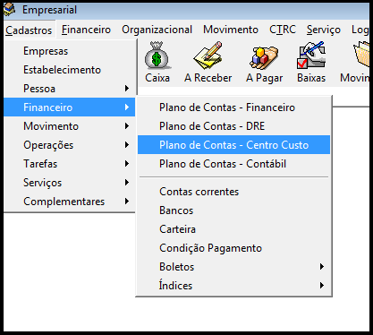 Para realizar acesso ao cadastro de Plano de Contas - Centro de Custo acesse, cadastros, financeiro e Plano de Contas-Centro Custo. Conforme imagem abaixo.
