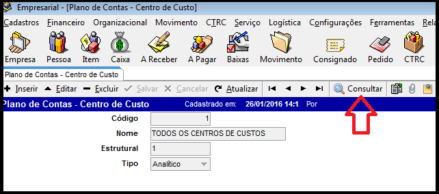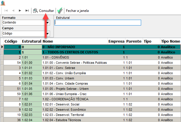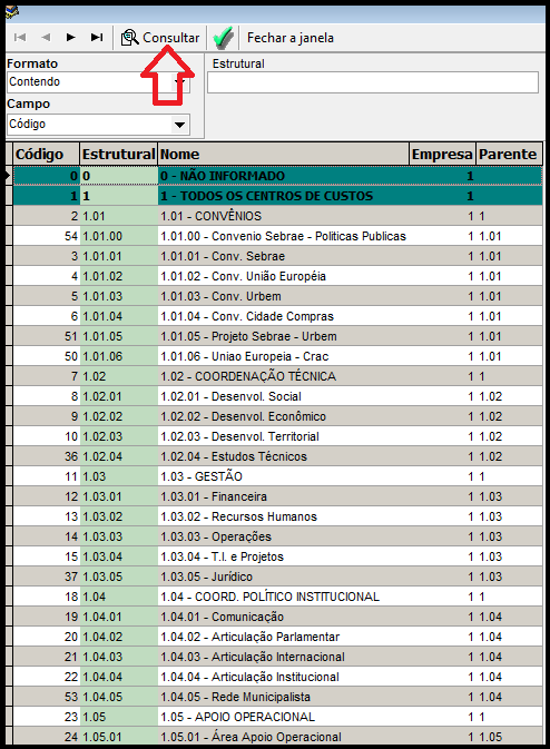 Ao acessar a tela clique em consultar e consultar novamente ira visualizar um modelo de plano de contas centro de custo no qual pode ser utilizado ou modificado conforme orientação da contabilidade. Conforme imagem abaixo.