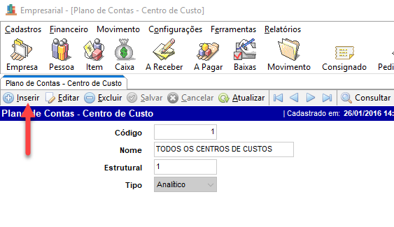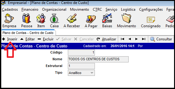 Para cadastrar um novo Plano de Contas - Centro de Custo clique no ícone inserir, preencha os campos necessários, clique em salvar e pronto, cadastro efetuado. Conforme imagem abaixo.