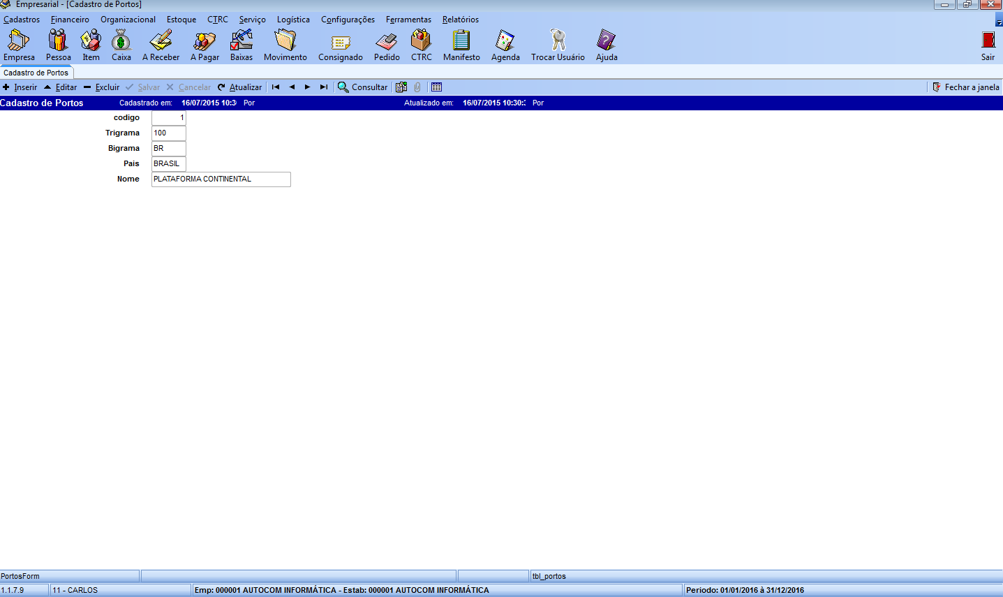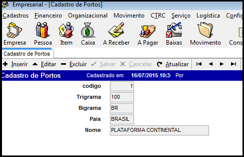 Para cadastrar um novo porto clique no ícone inserir, preencha os campos necessários, clique em salvar e pronto, cadastro efetuado. Conforme imagem abaixo.
