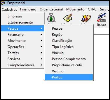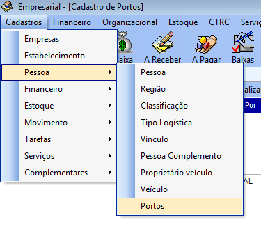 Para realizar acesso ao cadastro de Portos acesse, cadastros, pessoa e portos. Conforme imagem abaixo.