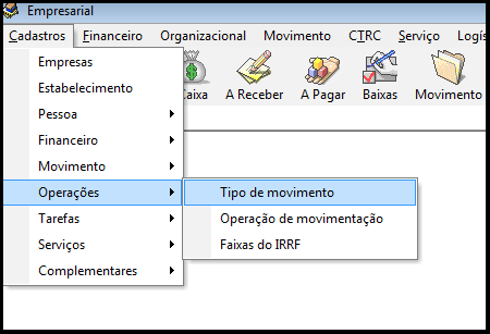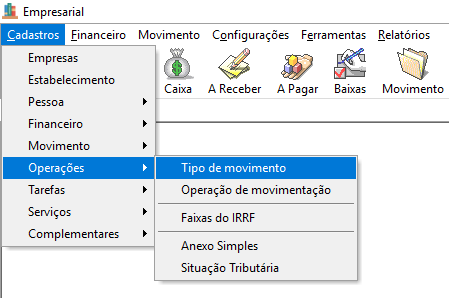 Para realizar acesso a consulta ou cadastro de Tipo de Movimento acesse, cadastros, operações e tipo de movimento. Conforme imagem abaixo.