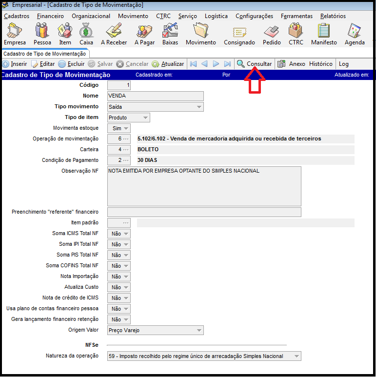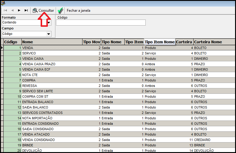 Ao acessar a tela clique em consultar e consultar na próxima tela novamente ira visualizar os Tipos de Movimento cadastrados no qual sera utilizado na operação de movimento. Conforme imagem abaixo.