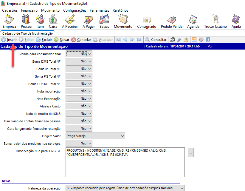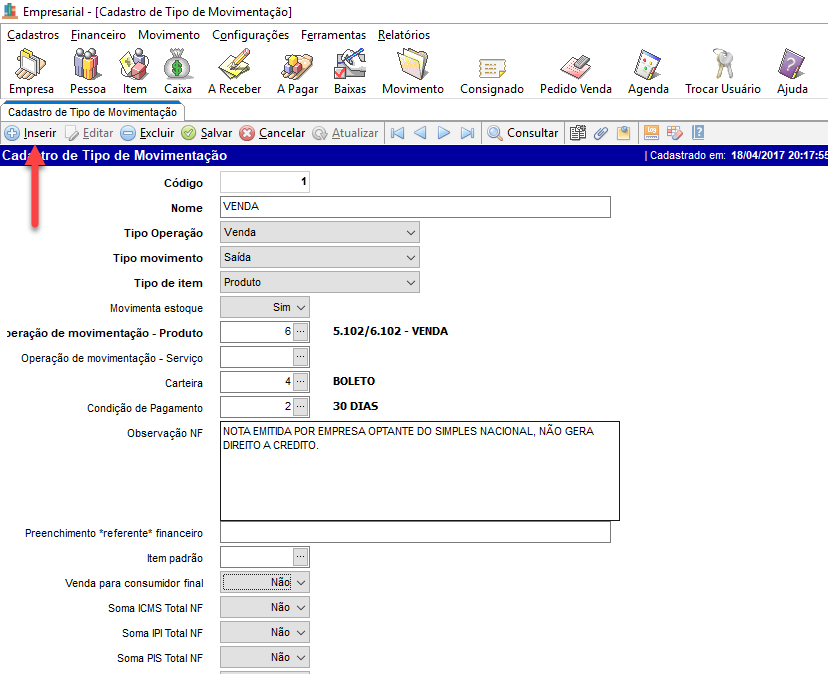 Para cadastrar Tipo de Movimento clique no ícone inserir, preencha os campos obrigatórios, clique em salvar e pronto, cadastro efetuado. Conforme imagem abaixo.