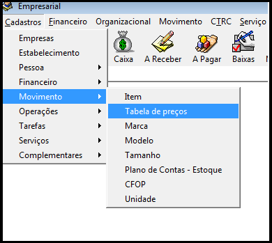 Para realizar acesso ao cadastro ou consulta de Tabela de preços acesse, cadastros, movimento e tabela de preços. Conforme imagem abaixo.
