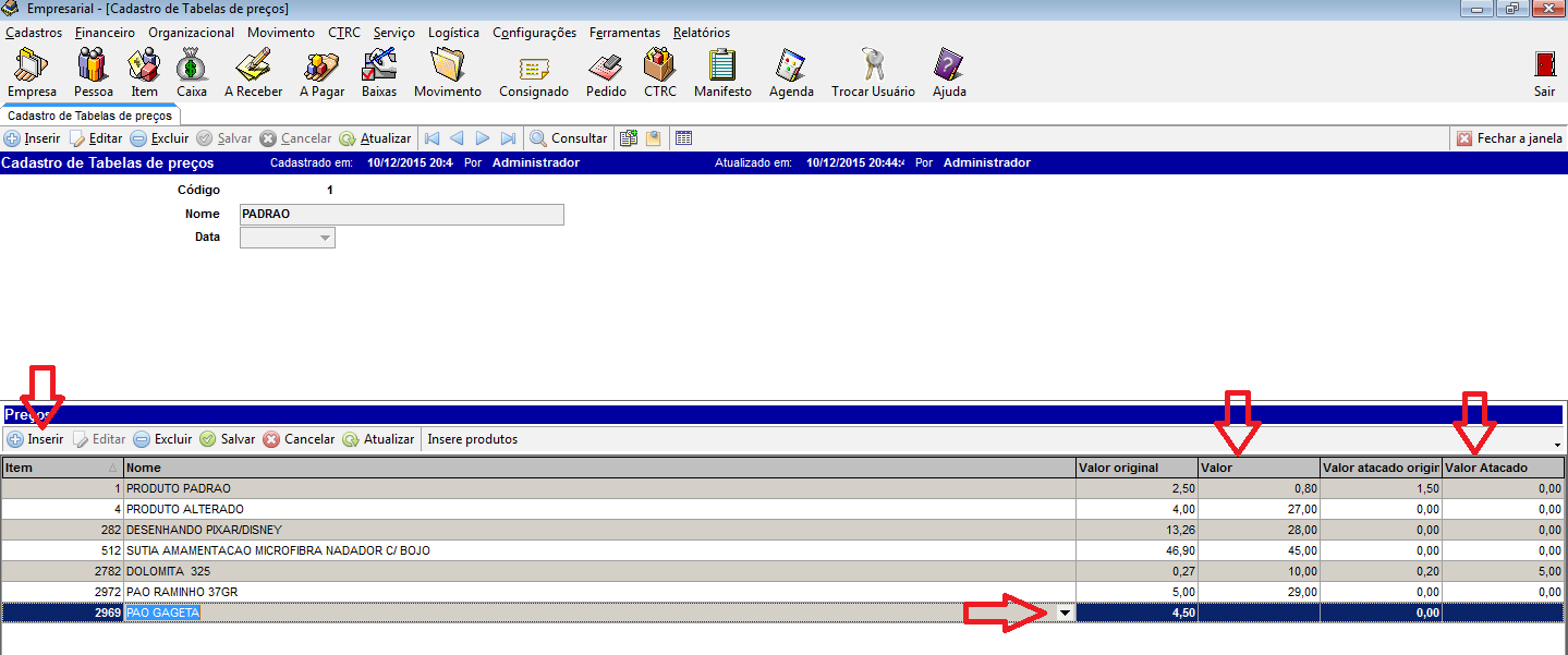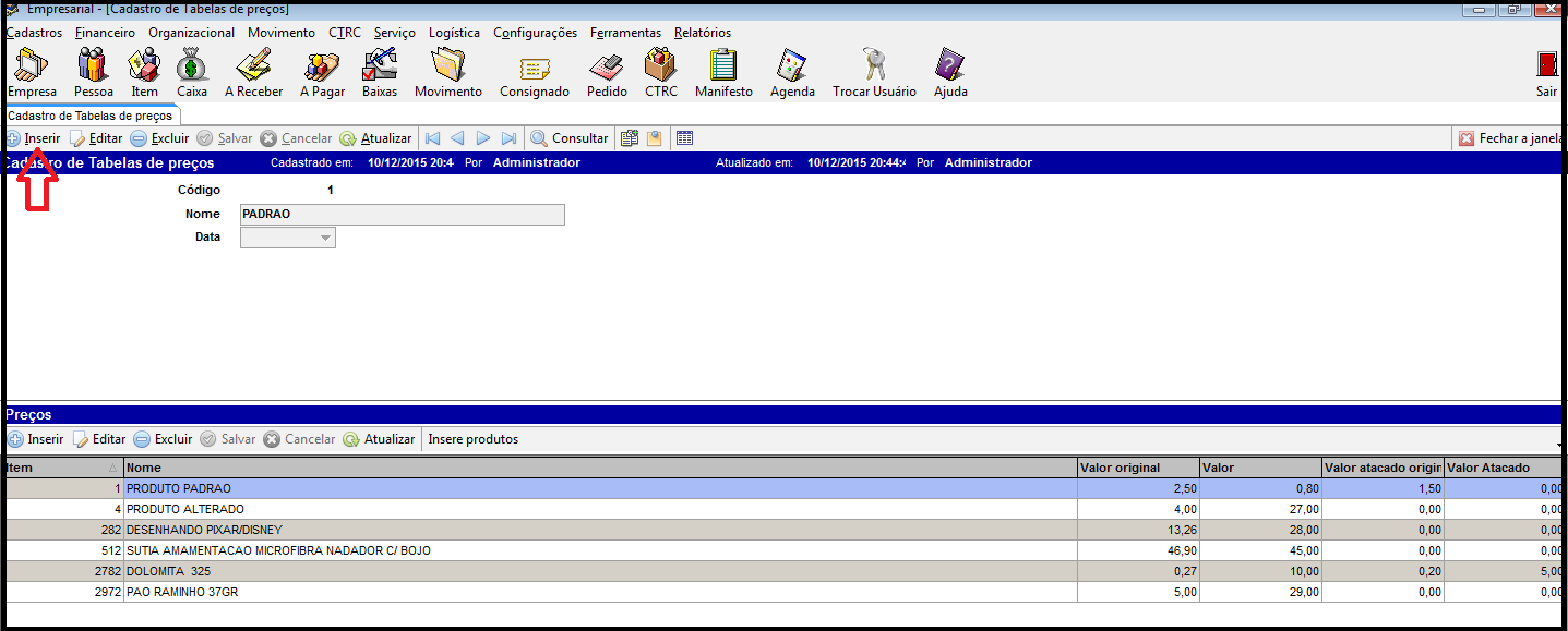 Para inserir os produtos e alterar os valores relacionado a tabela desejada, clique no ícone inserir, depois na linha do produto selecionando pelo filtro no ícone direto da linha, informe o valor na coluna direita a da coluna de valor original, informe o valor na coluna da direita a da coluna de valor atacado original, conforme a necessidade.