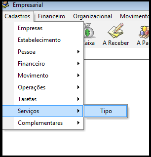 Para realizar acesso a consulta ou cadastro de Tipo acesse, cadastros, serviços e tipo. Conforme imagem abaixo.